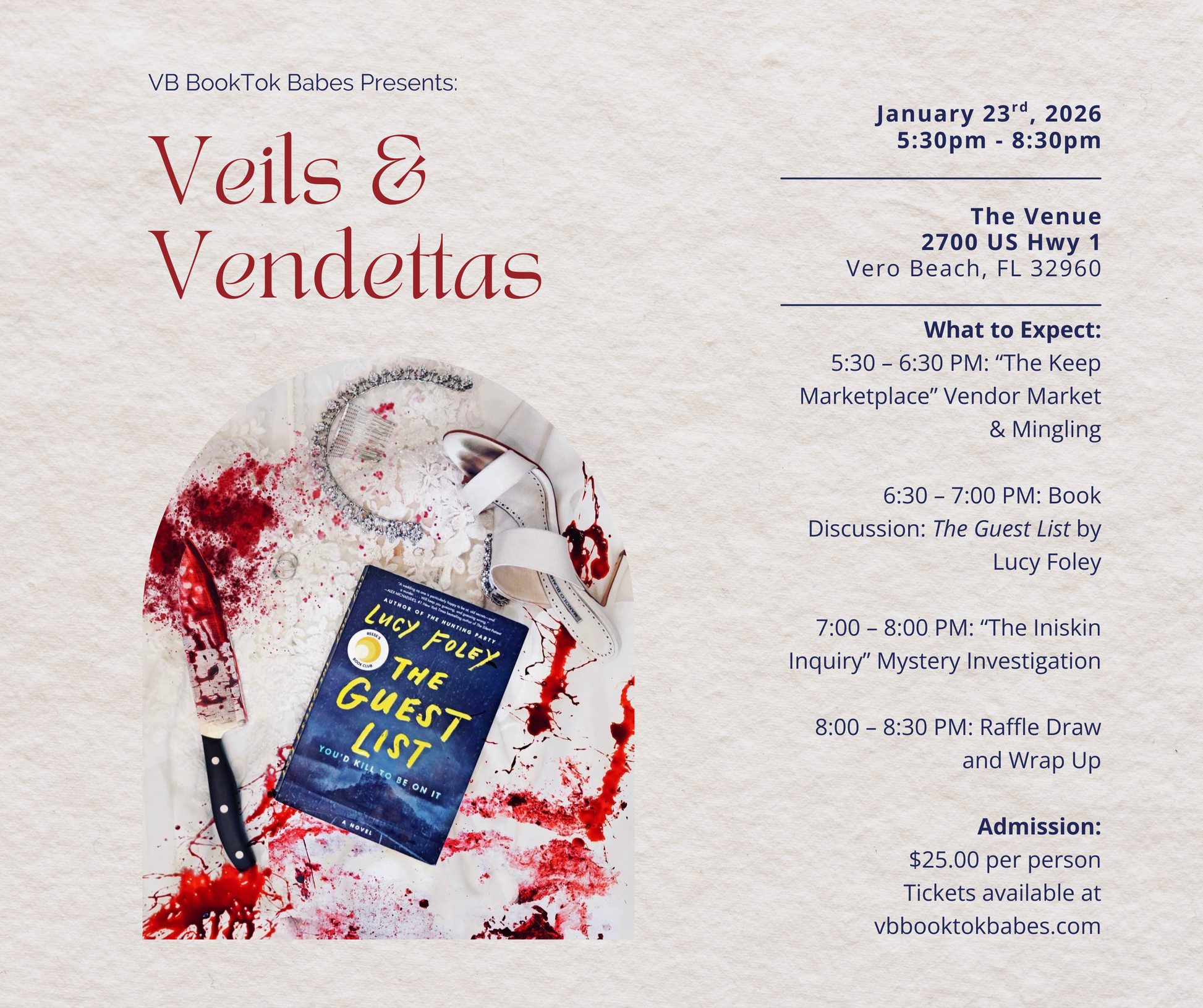 - 6:30 – 7:00 PM: Book Discussion – We’re breaking down The Guest List by Lucy Foley.